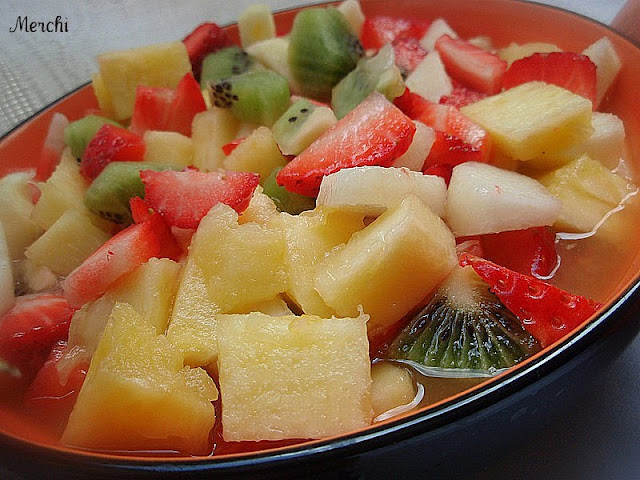 Divina questa macedonia,Merchi!Fresca e colorata,un modo squisito per finire un pranzo o una cena.