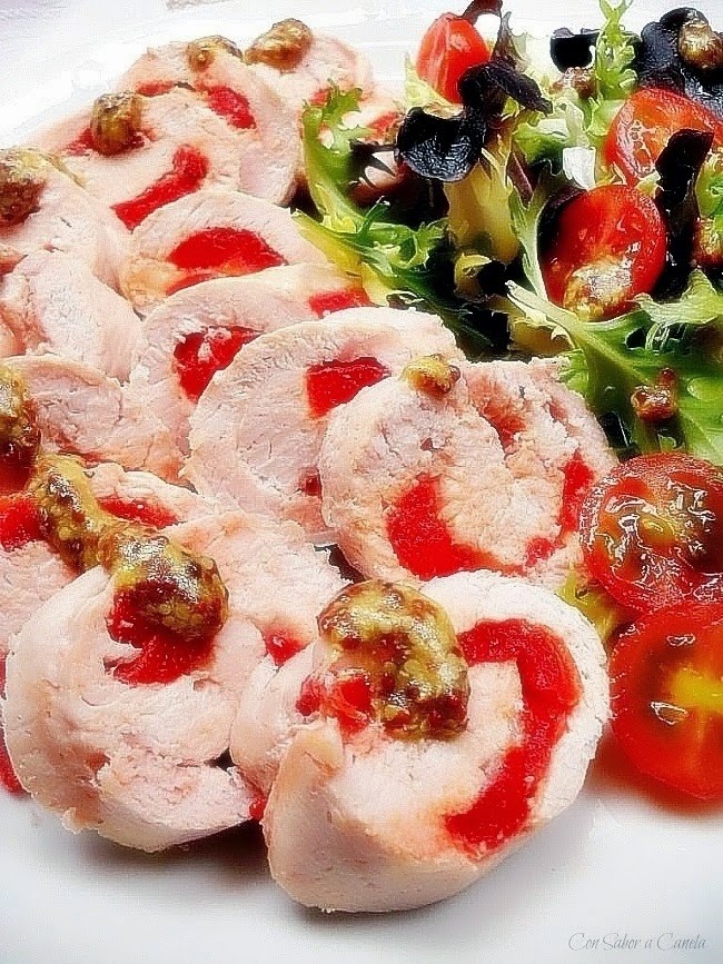 Merchi cielo que forma mas rica de preparar estos rollitos, que con ese pimiento asado tienen que saber a gloria bendita, y si despues el postre es un rico flan de esos que tienes mas abajo de manzana, se puede llamar una comida de fiesta total, las fotos lo dicen todo. Mil besicos cielo mio